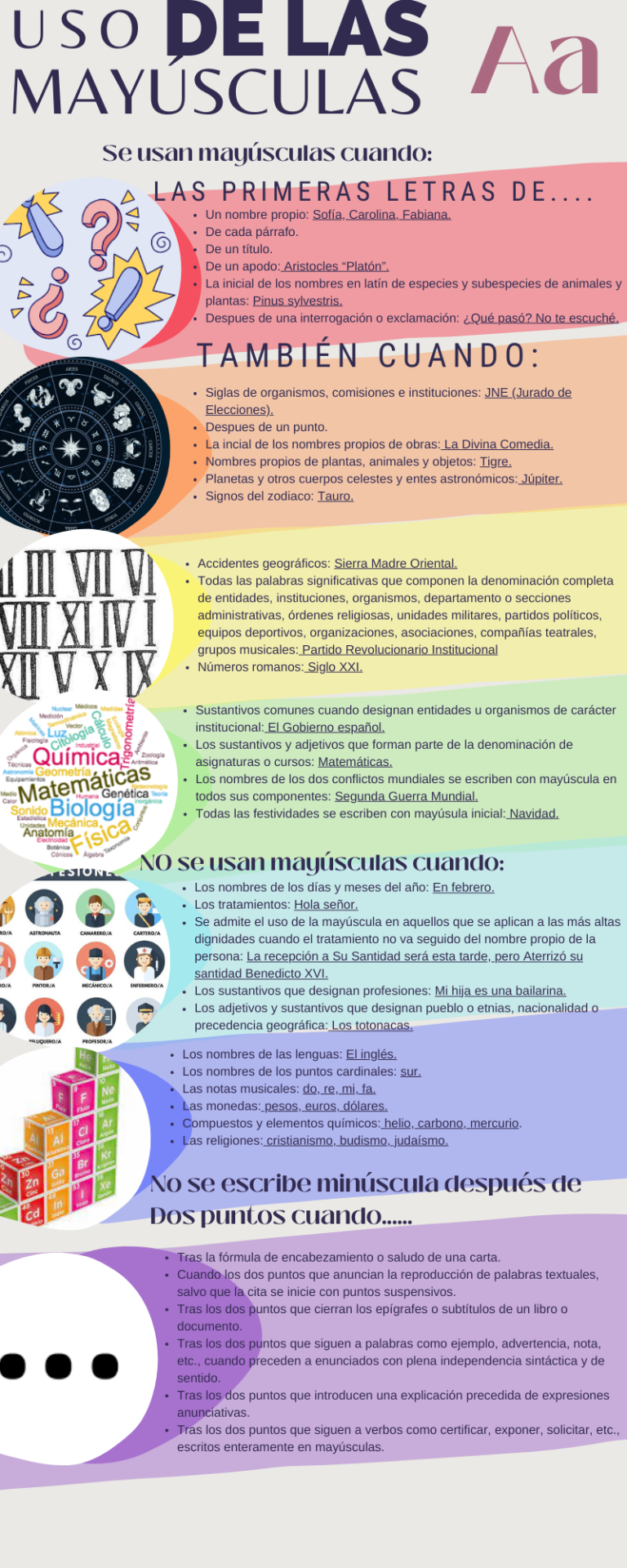 En esta parte de la web se puede encontrar los usos correctos de las mayúsculas. El tema de su uso es muy importante que decidimos hacer una sección solo para ello, representado en una infografia la cual lleva todas las reglas de cuándo se usan las mayúsculas y cuándo no, en total hay 37 reglas en las cuales se pueden encontrar ejemplos que pueden ayudar a entender mejor la regla y cómo ponerla en práctica. La mayoría de estas reglas son conocidas pero también hay otra porción de reglas que no todo el mundo conoce.